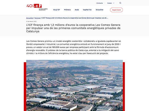 L’ICF finança amb 1,3 milions d'euros la cooperativa Les Comes Genera per impulsar una de les primeres comunitats energètiques privades de Catalunya